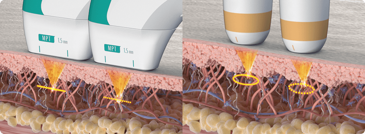 - MPT HIFU: Penetrates much deeper into the skin, reaching the SMAS layer (the same layer targeted in surgical facelifts) to achieve a more dramatic lifting and tightening effect.